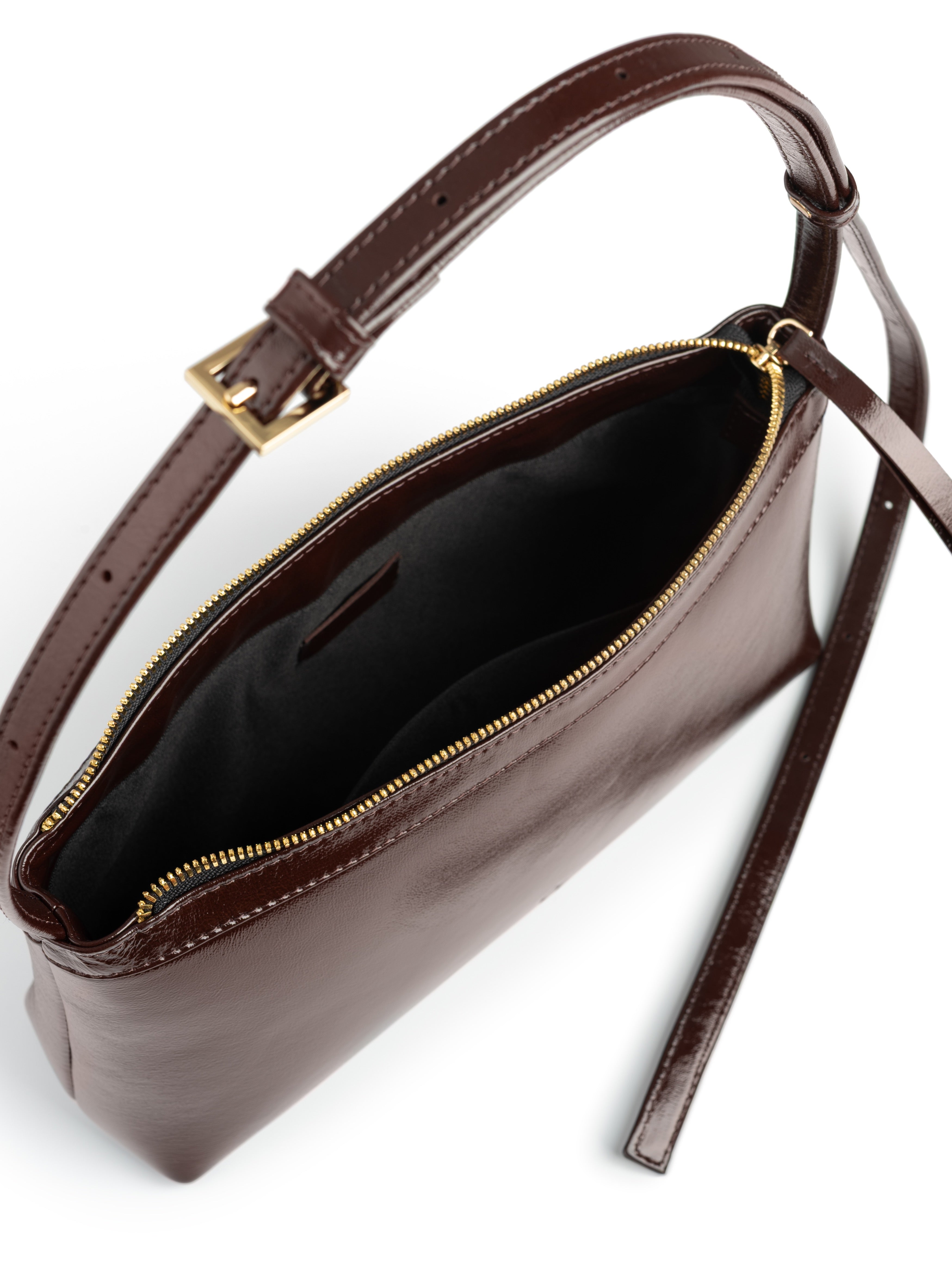 A medium-sized bag featuring an inner side pocket for small essentials, an adjustable shoulder strap, and a secure zip closure.